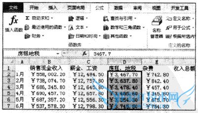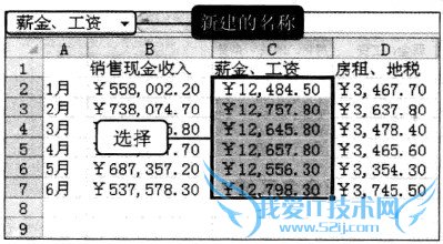 返回工作表,选择C2:C7单元格区域,便可以看到名称框中显示出了刚才创建的名称“薪金、工资”,也即是单元格C1中的数据。使用相同方法定义D2:D7和E2:E7单元格区域的名称为“房租、地税”和“杂费”。