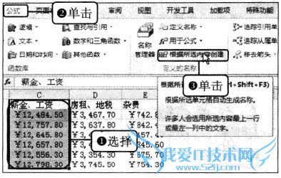 根据所选内容创建是指在选择的单元格区域中选择某一单元格中的数据作为名称,可以是首行、左行中的值,也可以是最左列、最右列中的值。