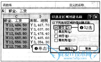 弹出“以选定区域创建名称”对话框,在“以下列选定区域的值创建名称”选项区域中选择所要创建的名称所在区域的值,这里选择“首行”复选框,然后单击“确定”按钮。