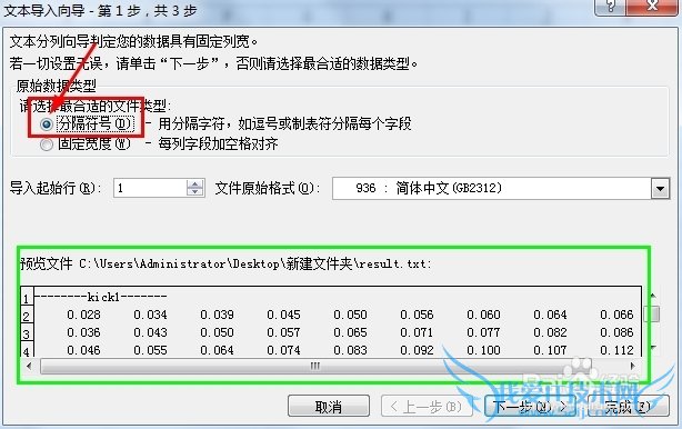 步奏四:选择合适的分隔符号,如tab,空格,分号,逗号等,不通编程语言输出的不同,可以试一下,本文是以空格为例,选择后预览出现列的情况,然后下一步。