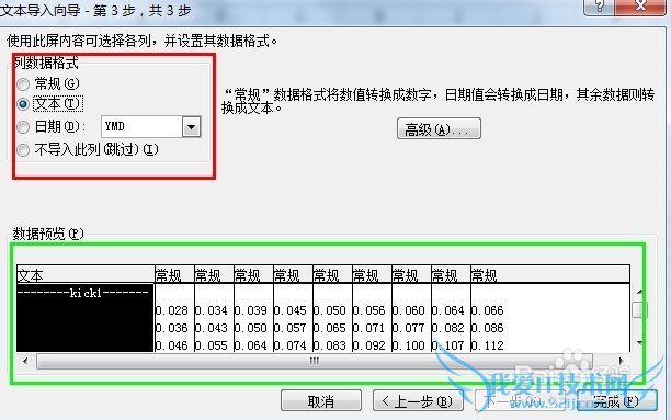 步骤五:接下来选择列数据格式,一般选择文本,常规也可以(之见区别还没遇到),预览区会出现行与列的情况,然后点击完成。