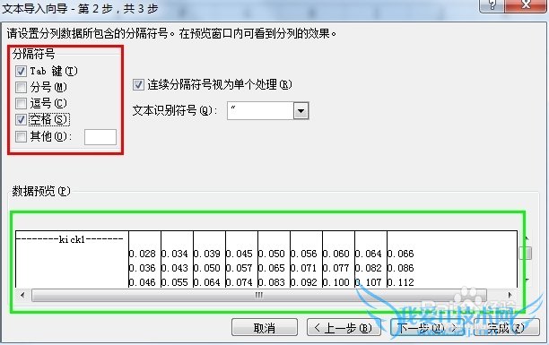 步奏三:打开后会弹出文本导入向导对话框,勾选红色框内的分隔符号,注意观察绿色框内的格式,然后下一步。