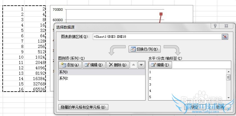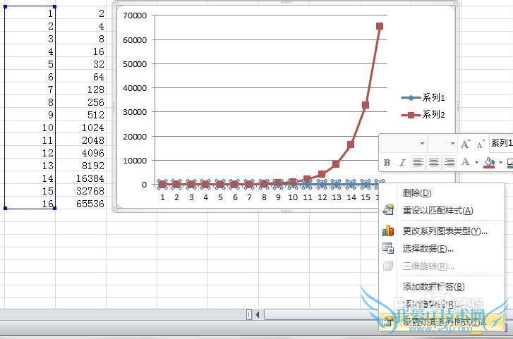 3、显然,此时的图表无法满足我们对图表详细观察的需求,故希望使用另外一个纵坐标来显示系列1的数据,便于我们更好的观察图表。