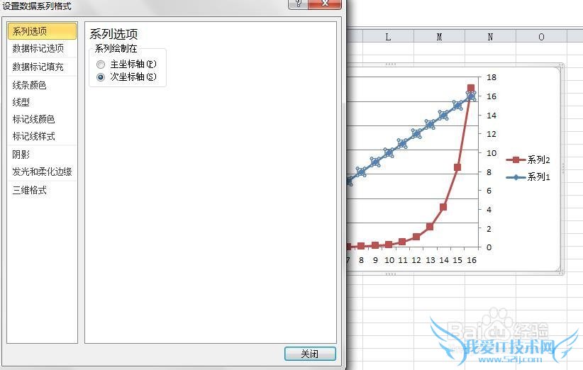 7、点击关闭按钮,退出设置数据系列格式,最终得到将系列1显示在次坐标轴上的图表,如下图: