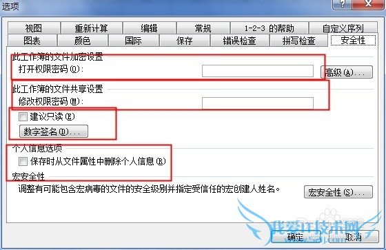 在弹出来的选项对话框,单击选择【安全性】,此刻下方就会出现【打开权限密码】还有【修改权限密码】输入选项了。