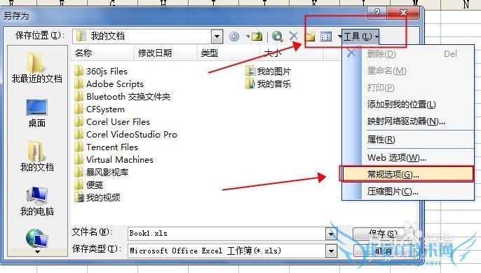 在文件【保存或者另存为】时不要直接点保存,在弹出的对话框选择【工具】——【常规选项】。
