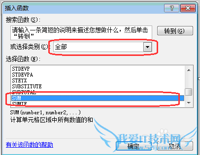 在弹出的窗口中,“或选择类别”中选择全部,“选择函数”中选择sum。如下图所示。单击确定按钮