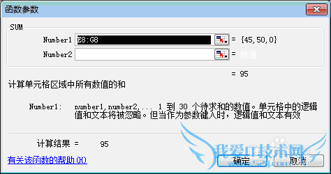 在又弹出的窗口中,number1中选择所有需要求和的数值,单击确定按钮。如下图所示。如果需要求和的值分布在两个不连续的地方,则在number2中选择另外一个区域的数据。