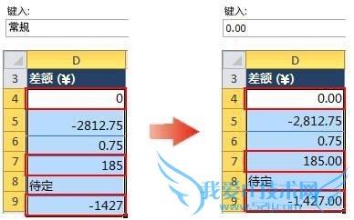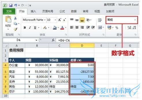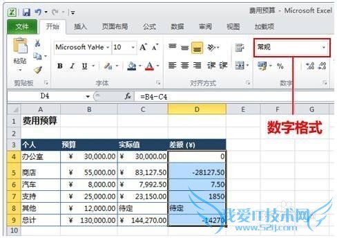 选中D4单元格到D9单元格的区域,也就是“差额”这一列。将常规格式运用到当中。