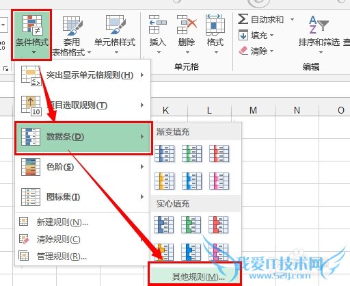 依次点击 开始,条件格式,数据条,其他规则 :