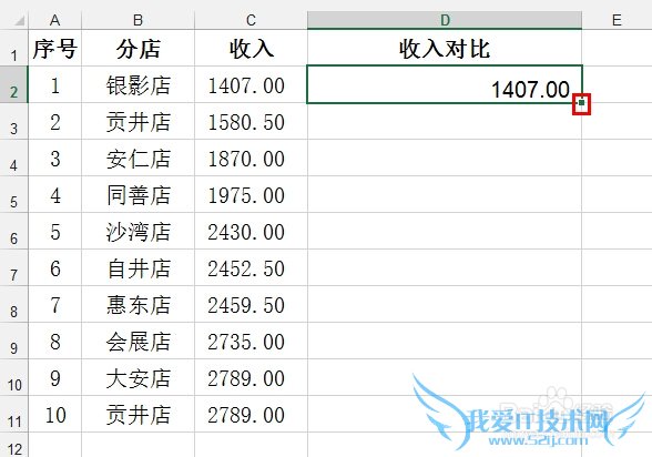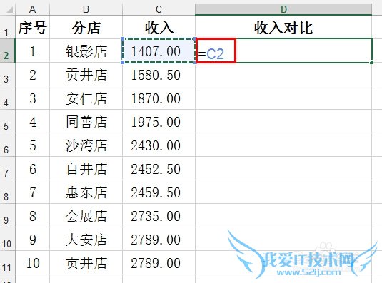 在D2单元格输入公式=C2 后回车:
