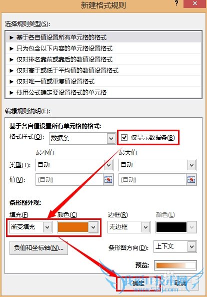 勾选 仅显示数据条 ,然后选择 填充 为 渐变填充 ,颜色 为任意一种颜色 ,然后点击 确定 :
