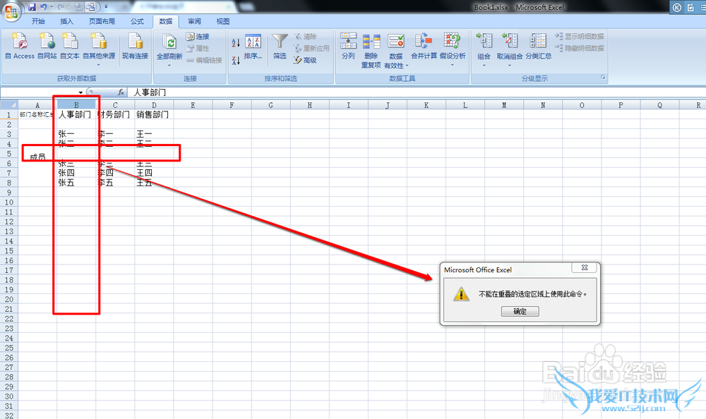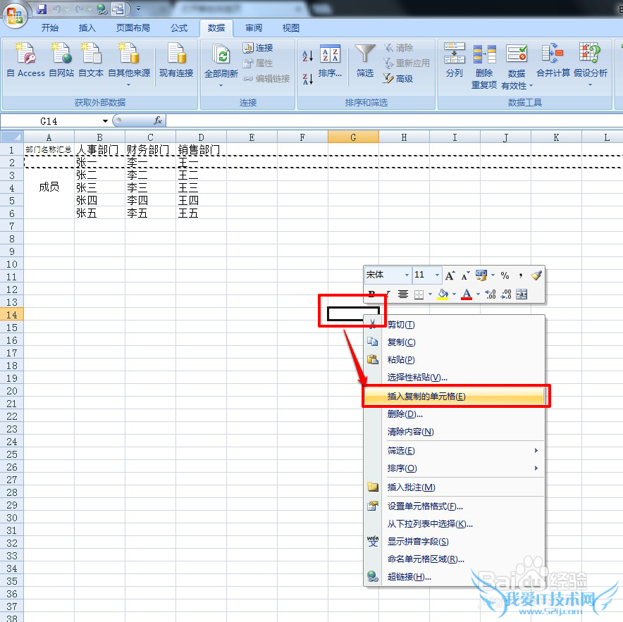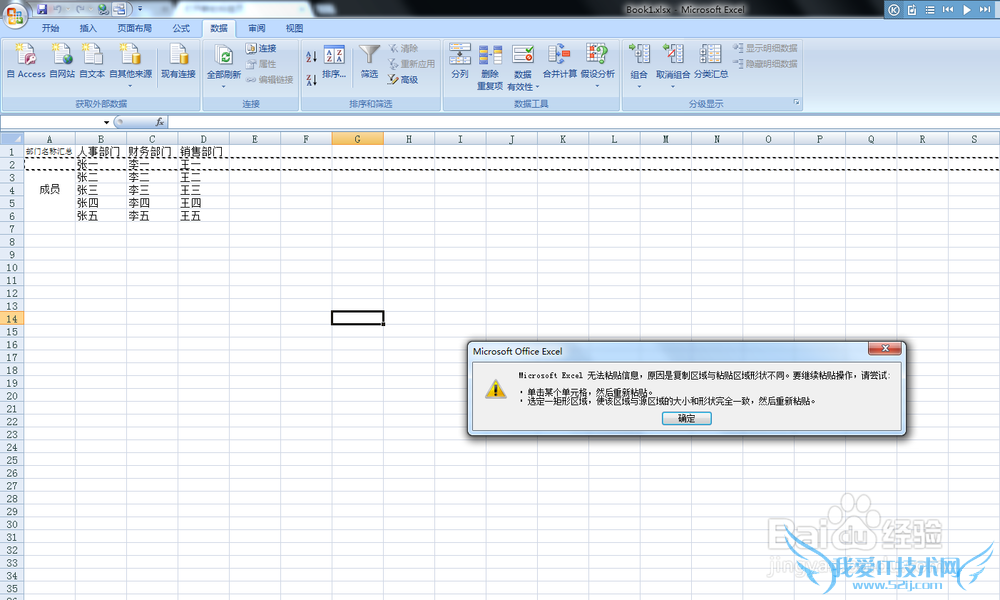 下面,我们做个小小的实验,如上图,我们随意在一个单元格右击鼠标,然后找到“插入复制的单元格”会出现如下图的提示,也就是说,我们插入行或列必须是选中一个行或列然后进行插入。