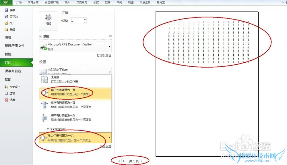 我们点击上图设置里最后一个选项 可以看到将工作表调整为一页 现在就都在一张纸上了