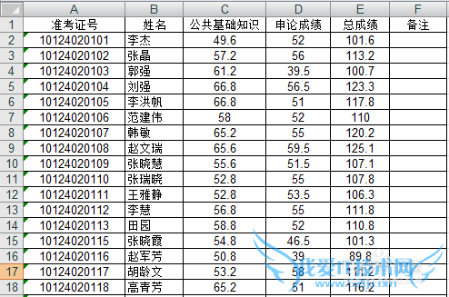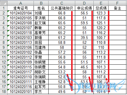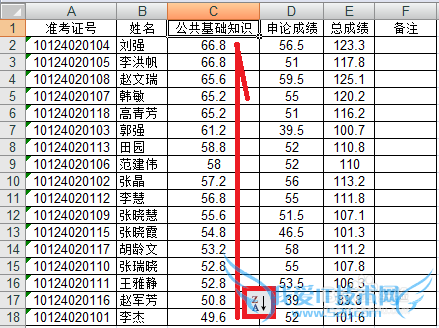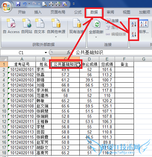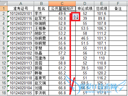 对公共基础知识进行排序的话,鼠标点击公共基础知识列的任意一个单元格,然后点击 数据 ,升序 或者 降序 按钮即可对考生成绩进行排序: