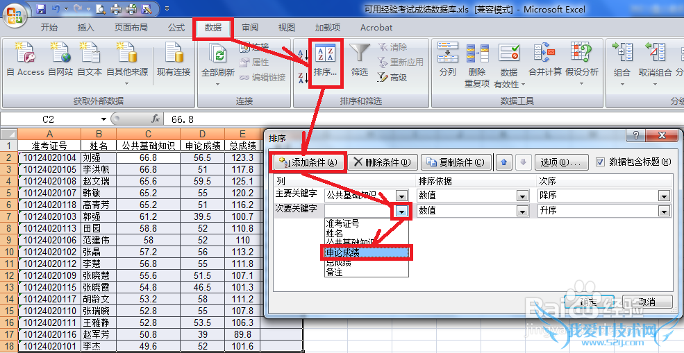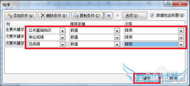 鼠标定位到要排序的数据中的任意单元格,然后依次点击 数据,排序 。在弹出的对话框中设置排序的关键字顺序。主要关键字 选择 公共基础知识 ,然后在“次要关键字”栏选择第二个排序依据,即“申论成绩”,点击 确定 即可对数据进行排序: