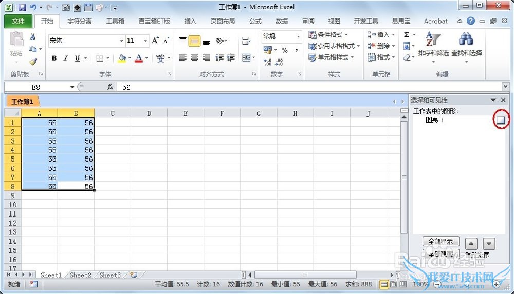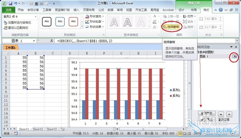 再点击选择窗格,把面板打开,可以看到图表有眼睛图样,点击即可