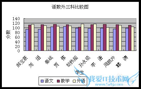 ③图标标题:语数外三科比较图;分类(X)轴标题:学生;分类(Y)轴标题:分数;图例位置:底部。