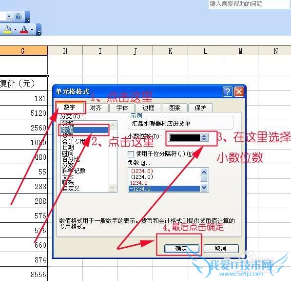 在弹出的“单元格格式”对话框中,点击“数字”,“数值”,在”框中属入“1”。