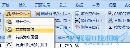 然后选择【慧办公】→【断开公式】→【文本转数字】,如下图(为了使用方便,最好添加到快速访问栏)