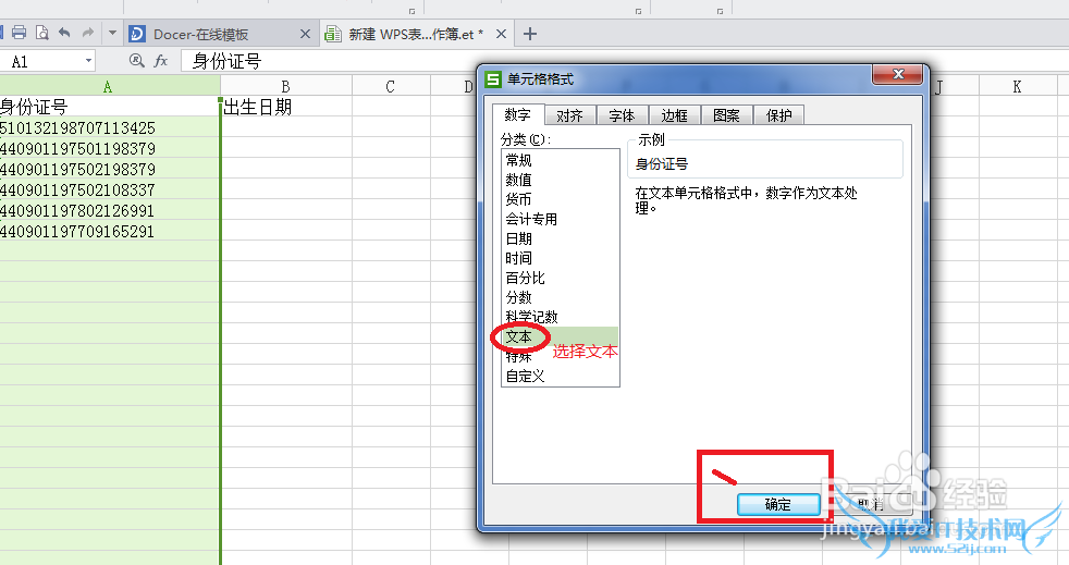 二、选中身份号栏,右键设置单元格格式,设置为文本格式;