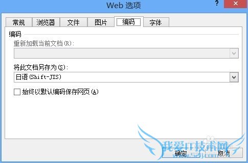 在Web选项对话框中,选择“编码选项卡-将此文档另存为-日语(Shift-JIS)”,如果是其他语言可根据需要选择;