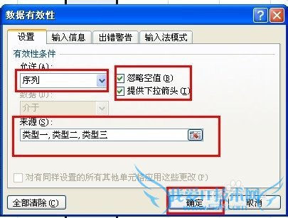 (4)在弹出的数据有效性对话框里,在“设置”面板,选择允许“序列”,忽略空值,提供下拉箭头,“来源”这一项就是要填写的下拉列表的内容,注意分隔符是英文的逗号。