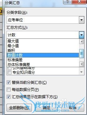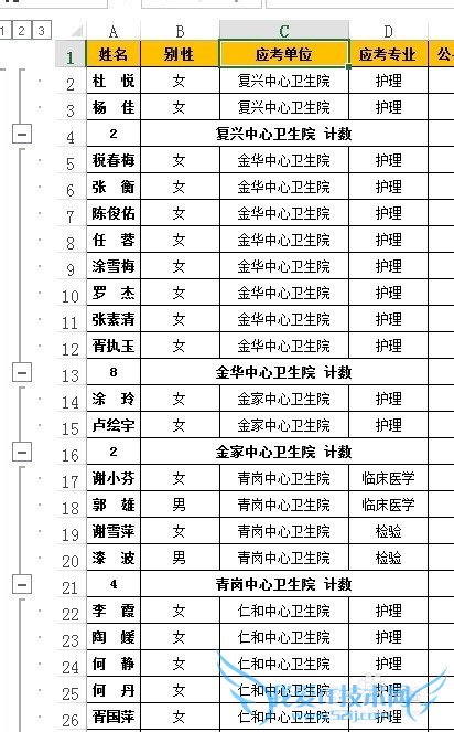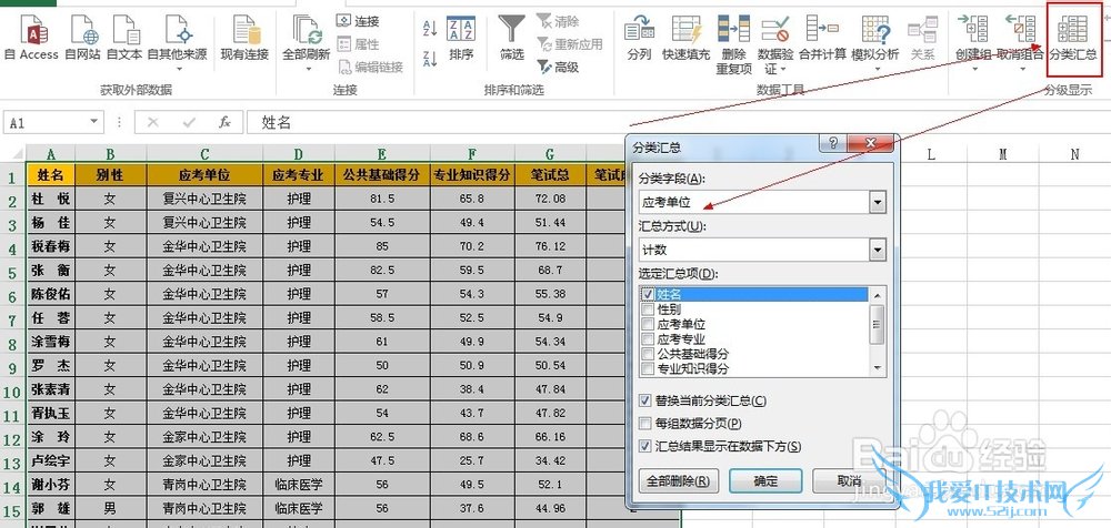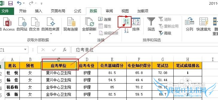 步骤1、按照应考单位进行排序(非常重要,很多初次使用分类汇总功能的用户不能得到正确结果就是因为,这里没有操作。)