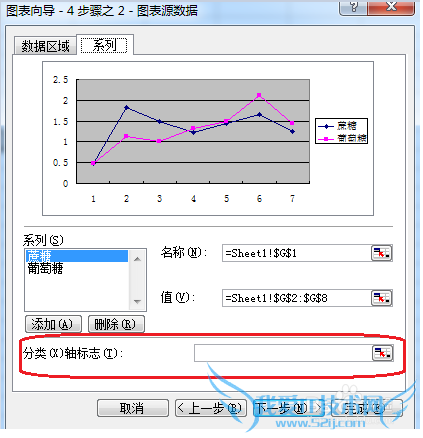 (3)数据区域选择上图表中的“蔗糖”格至右下角的“1.44”格,点击“系列产生在行”,再在本窗口中单击“系列”菜单。“分类(x)轴标志”的数据区域选择表格中“0值”格向下至“60值”格,注意这里不要选择“糖浓度(g/L)”那格。点击“下一步”按钮。