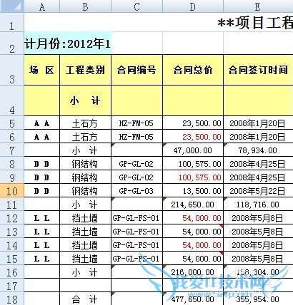 比如,我们希望在土石方、钢结构、挡土墙的后面插入一个小计行,并且自动求和