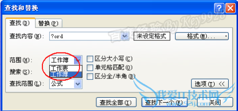 在整个工作簿中进行查找。在“查找和替换”对话框中单击“选项”按钮,在“范围”右侧的下拉列表中选择“工作簿”,则Excel会在工作簿中的所有工作表中进行查找。