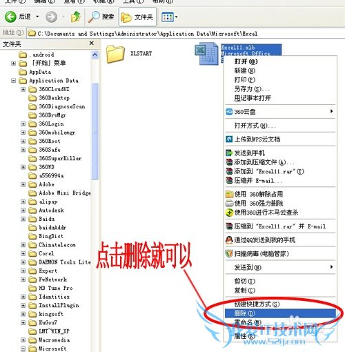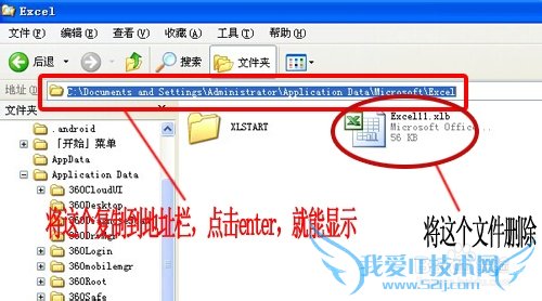 将“C:\Documents and Settings\Administrator\Application Data\Microsoft\Excel ”复制到我的电脑的地址栏里面,然后点击“enter”。找到 Excel11.xlb删除(2007版本,删除 Excel12.xlb;2010版本,删除 Excel14.xlb)【假如没有找到,点击导航栏,工具——文件夹选项——查看——显示所有文件和文件夹——确定】