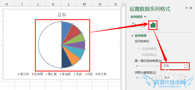 点击图表区,然后点击 系列选项 ,在 第一扇区起始角度 位置输入 270 :