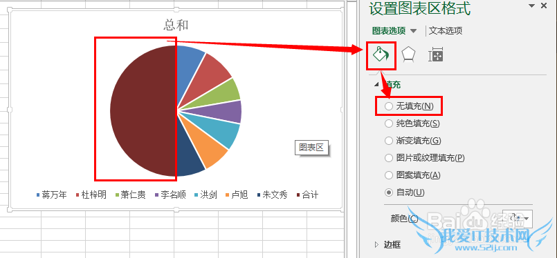 连续点击两次 图表区的合计 (不是双击),即占了1/2的图块,然后点击 填充,无填充 :
