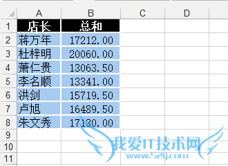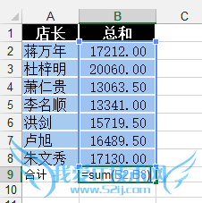 在原有数据的最下面,输入一个辅助行。第一个单元格输入 合计 ,第二个单元格输入公式=sum(b2:b8) ,以对以上的数据进行求和: