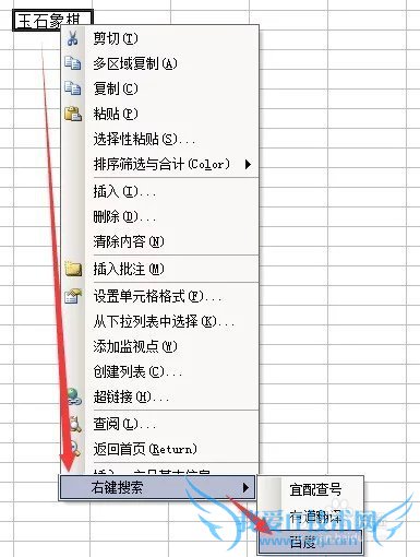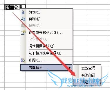单元格内容是“玉石象棋”,可是想在百度中查询 “玉石”操作:选中玉石 》按Ctrl+C 复制 》右键查询