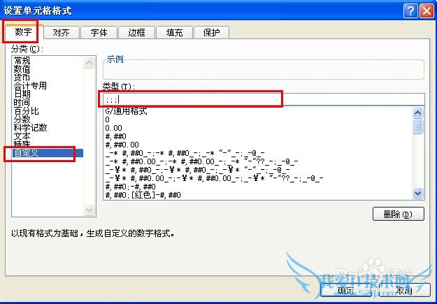 第二种方法对数据的保护更为严密,首先选中所要隐藏的数据,单击右键,在其菜单中选择设置单元格格式命令,弹出设置单元格格式对话框,在该对话框的数字菜单下单击自定义分类,然后在类型(T)下的方框中输入;;;(三个分号),单击确定按钮即可。