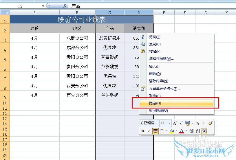 打开Excel,选中所要隐藏的行或列,单击右键,在右键快捷菜单中选择隐藏命令,或按快捷键(行为ctrl+9,列为ctrl+0),即可将所选的行或列隐藏。