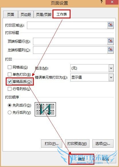 点击 工作表 选项卡,然后勾选 草稿品质 后,点击 确定 :
