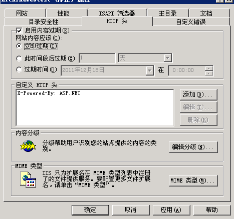 3)接下来就是到存在需要进行缓存配置文件的目录下面,首先选择一个需要缓存扩展名的文件,点击右键,选择属性,选择“HTTP头”选卡,进行2.a)中的配置,并保存;接下来就有对这个文件目录下面所有相同扩展名的文件进行该设置了,此时需要修改IIS的配置文件实现。