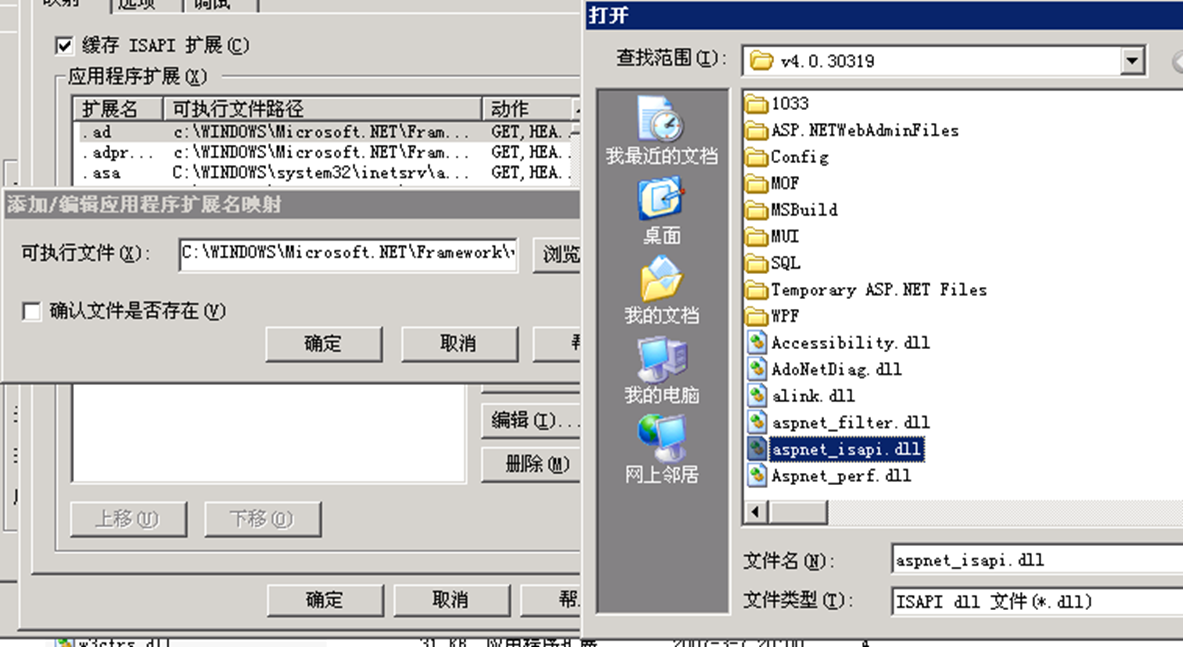 2) 在“通配符应用程序映射(执行顺序)”一栏下面,点击“插入”按钮,在弹出的文件选择框时选择 C: \WINDOWS\Microsoft.NET\Framework\v4.0.30319\aspnet_isapi.dll 文件,其中“C:”是系统盘,不要勾选“确认文件是否存在”,具体如下: