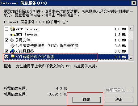 选中图片中的“文件传输协议(ftp)服务”然后点击“确定”