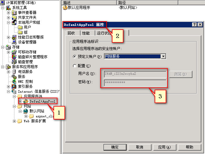 2.1 应用程序池标识异常,检查应用程序池中的用户是否被禁用,账户密码是否正常