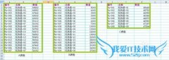 如图示,有三个表格分别为A,B,C.为视图方便,暂将三个表格显示在一个工作表中。可观察到:三个表格有相同编号,且表A,B有编号重复项。现需将编号为:PA-001~13数量...