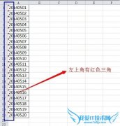 类别:excel教程 发布时间:16-04-04 点击:1843如下图所示,A列数字前都带有红色的三角,这是因为每个数字前面都带有单引号造成的。我们查看编辑栏,左上角有单引号。前期准备工作(包括相关工具或所使用的原料等...
