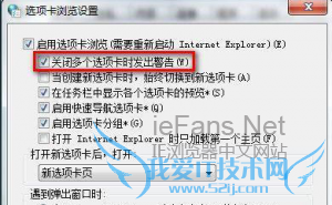 3、弹出选项卡浏览设置窗口,将“关闭多个选项卡时发出的警告”前面的对勾去掉,点击确定保存;