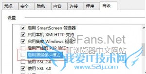 首先,打开Internet选项,进入“高级”选项卡,在“安全”子选项的设置里面,禁用掉“启用增强保护模式”一项(去掉前面的勾),如图。