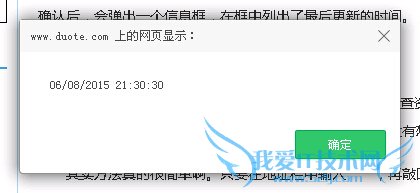 我们在使用IE浏览器浏览网页的时候,有时候会很好奇目前所看到的网页是什么时候更新的呢?有些网站会在网页的明显处写上最后更新于XX时间,但是对于没有写上的网页我们仍可以知道它的确切更新时间。有什么方法能查看到更新时间呢?<>方法是首先打开该站点,接着在浏览器的地址栏中输入:javascript:alert(document.lastModified)。确认后,会弹出一个信息框,在框中列出了最后更新的时间。
