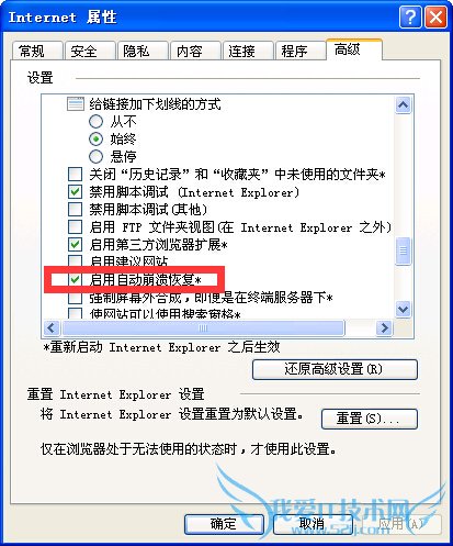 答:1.点击“工具”按钮,选择“Internet 选项”。 2.单击“高级”选项卡;在浏览部分中,勾寻自动崩溃恢复”复选框。 重启浏览器 >>详细