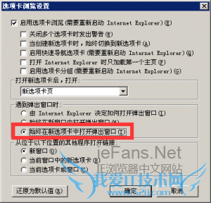 答:ie8——工具,ie9——齿轮 internet选项 常规 选线卡(更改网页在选项卡中的显示方式) 点设置,弹出一个小窗口 遇到弹出窗口时 选择第三个(始终在新选项卡中打开) >>详细